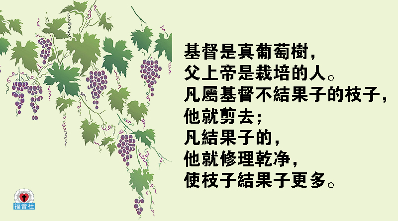 1「我是真葡萄樹,我父是栽培的人。2凡屬我不結果子的枝子,他就剪去;凡結果子的,他就修理乾淨,使枝子結果子更多。3現在你們因我講給你們的道,已經乾淨了。4你們要常在我裏面,我也常在你們裏面。枝子若不常在葡萄樹上,自己就不能結果子;你們若不常在我裏面,也是這樣。5我是葡萄樹,你們是枝子。常在我裏面的,我也常在他裏面,這人就多結果子;因為離了我,你們就不能做甚麼。6人若不常在我裏面,就像枝子丟在外面枯乾,人拾起來,扔在火裏燒了。7你們若常在我裏面,我的話也常在你們裏面,凡你們所願意的,祈求,就給你們成就。8你們多結果子,我父就因此得榮耀,你們也就是我的門徒了。9我愛你們,正如父愛我一樣;你們要常在我的愛裏。10你們若遵守我的命令,就常在我的愛裏,正如我遵守了我父的命令,常在他的愛裏。